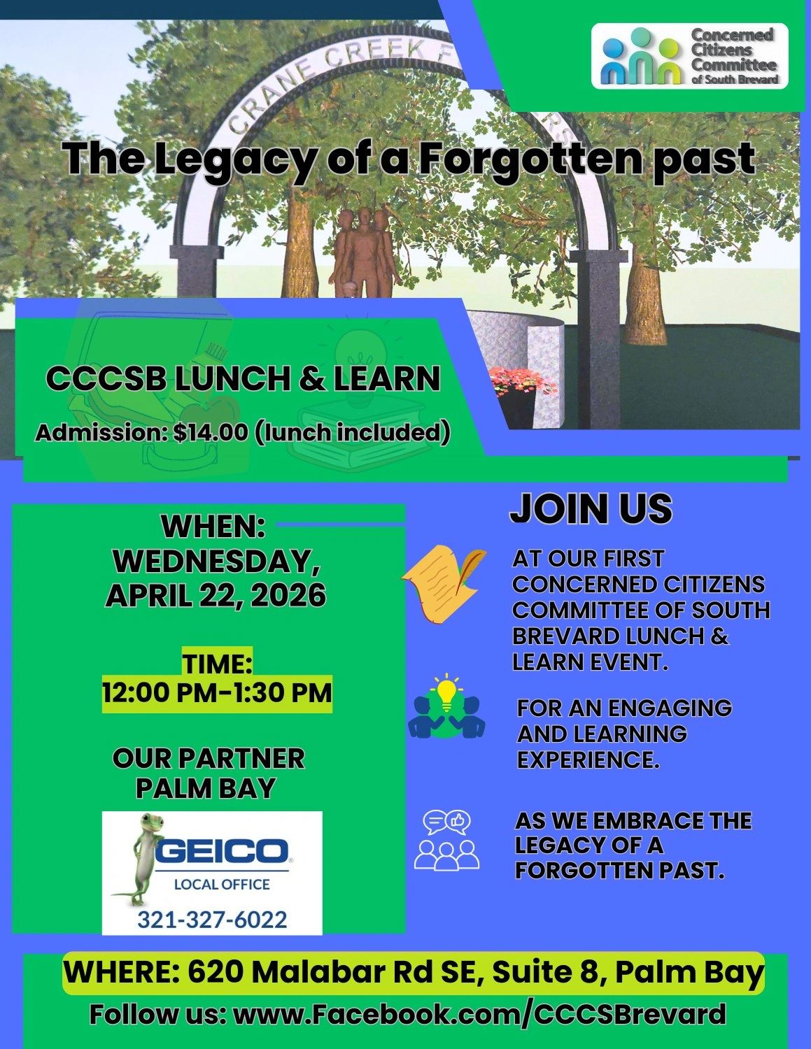 Join the CCCSB and the local GEICO office (Palm Bay) for our first Lunch & Learn event. Step into an afternoon of learning, connection, and purpose; it will be a meaningful gathering designed to celebrate history, community, and to commemorate the lives of the three founders of the city of Melbourne.